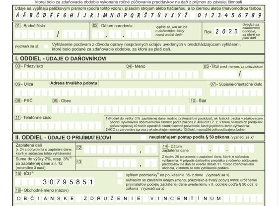 Naše údaje Ako poukázať 2 alebo 3% z dane: Som zamestnanec Ak by ste potrebovali poradiť s vyplnením tlačiva, ozvite sa nám na vincentinum@vdp.sk a…